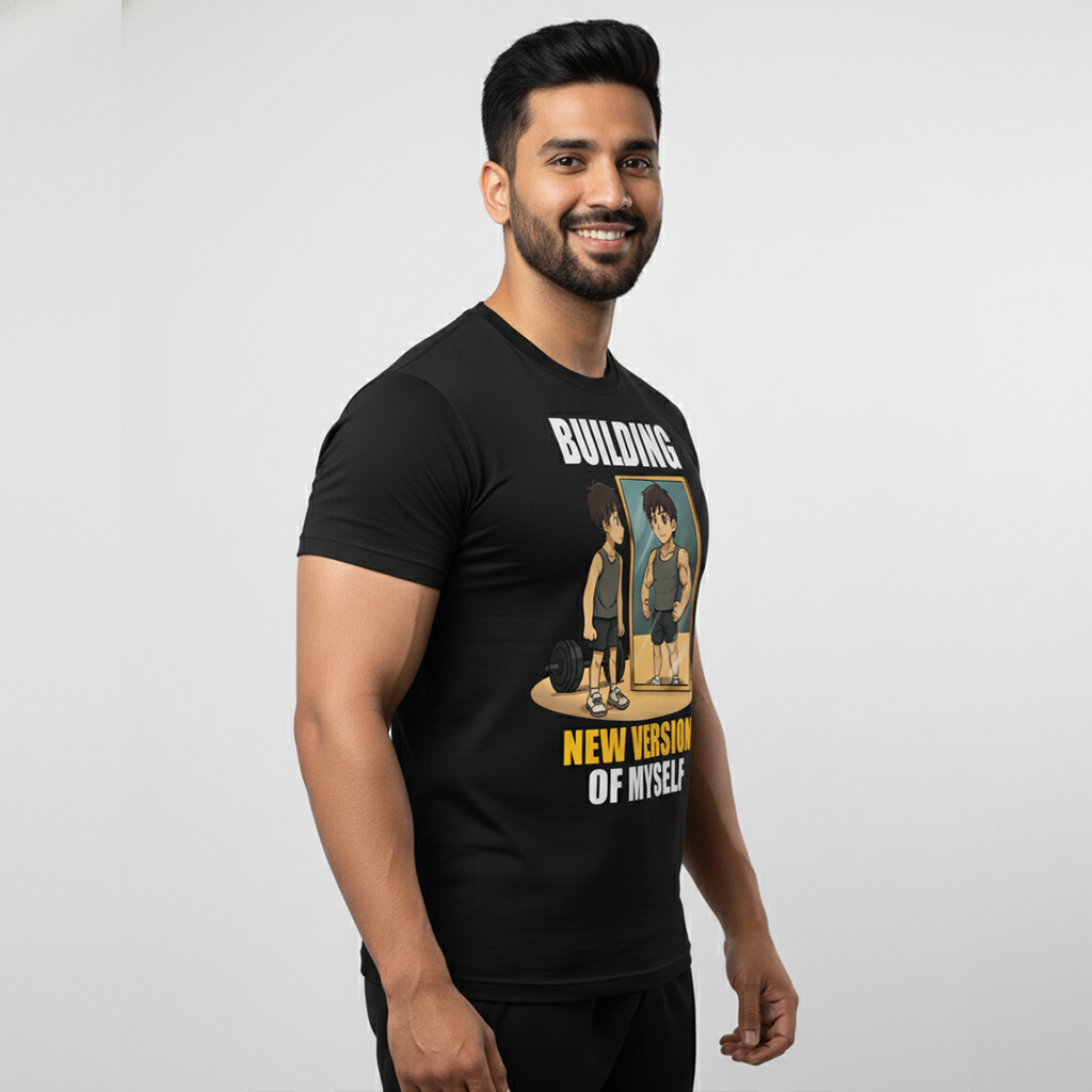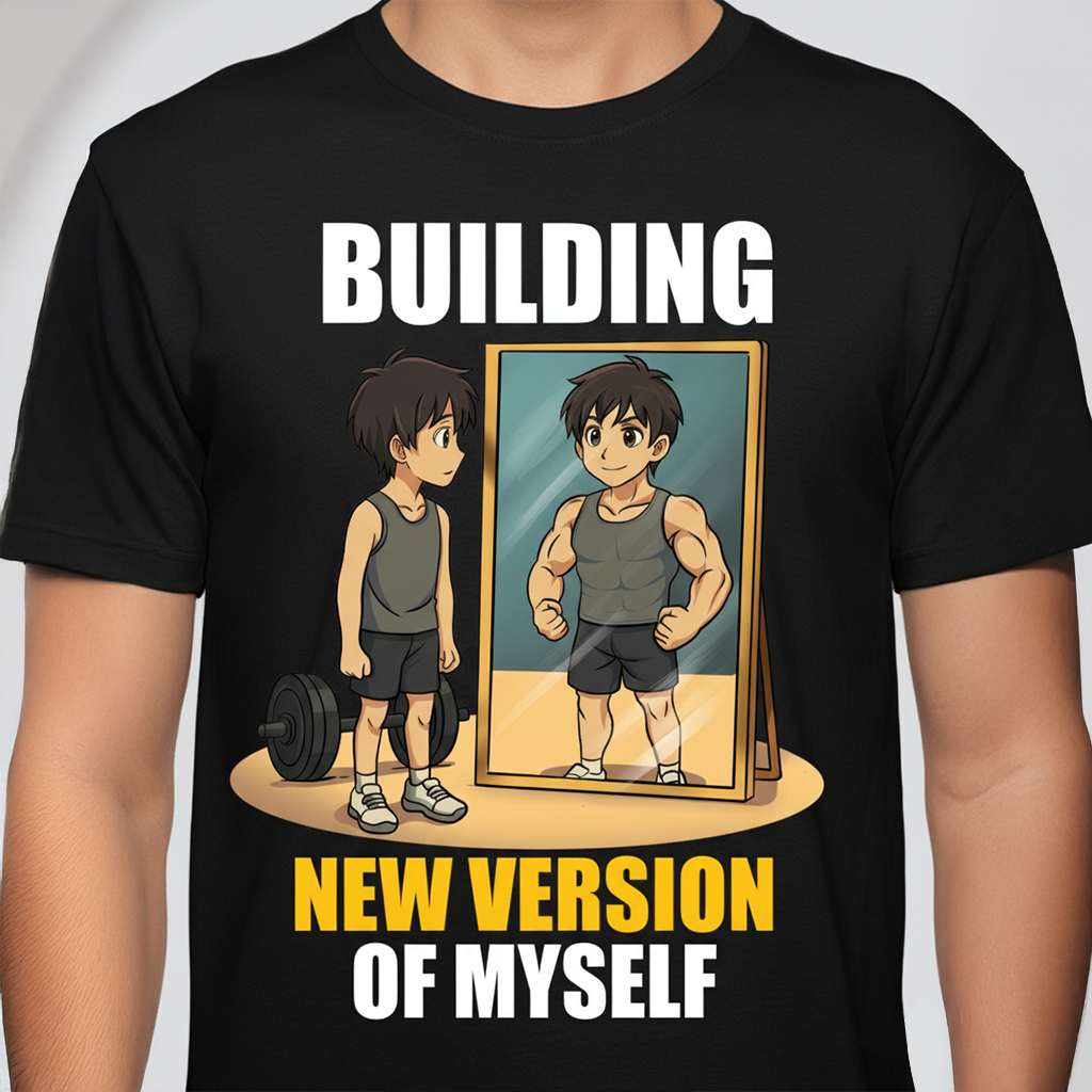 Introducing the ‘Building New Version of Myself T-Shirt’. This design is for every person in the middle of their transformation—the one who sees their goal in the mirror, even when the world doesn’t see it yet. It’s a tribute to the early mornings, the late-night sessions, the extra reps, and the relentless consistency.