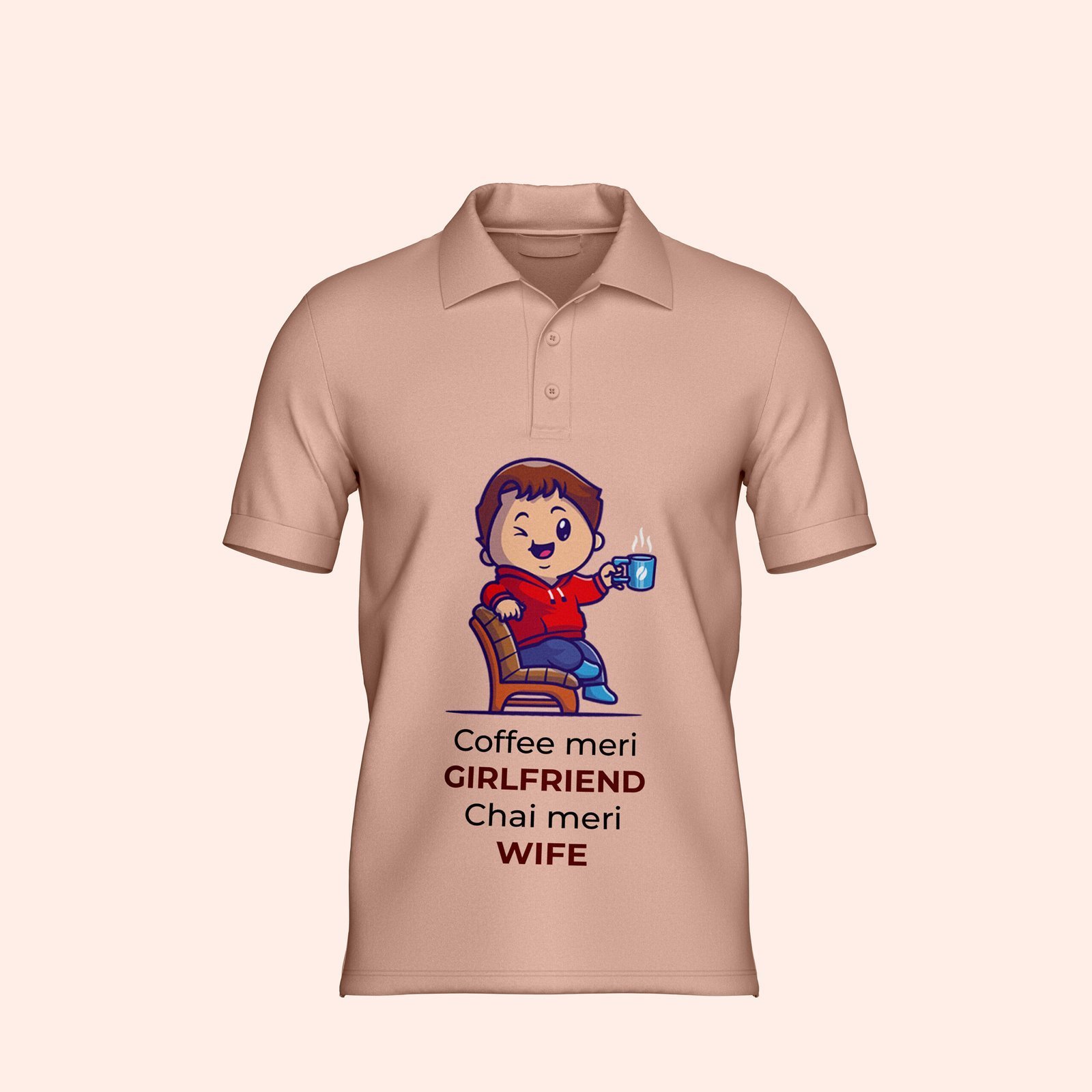 Elevate your wardrobe with the “Coffee Meri Girl Friend and Chai Meri Wife” Unisex Collared T-Shirt from it’s Crazy. Designed for both men and women, this collared t-shirt redefines casual luxury with its aesthetically pleasing design and premium fabric. The charming illustration paired with the quirky tagline celebrates a love for coffee and tea with a modern twist, making it a perfect conversation starter.